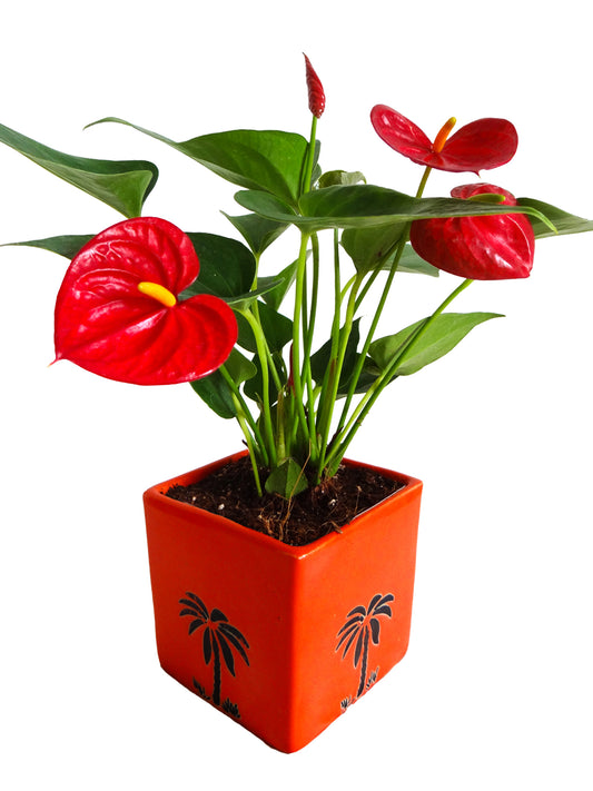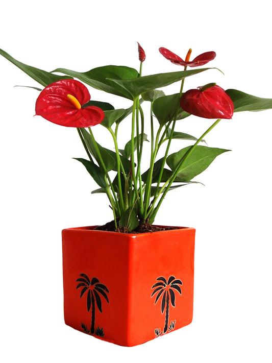 Exotic Anthurium Red Plant in Orange Cube Aroez Ceramic Pot