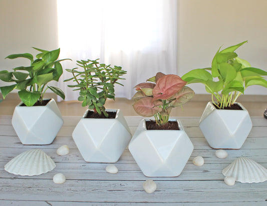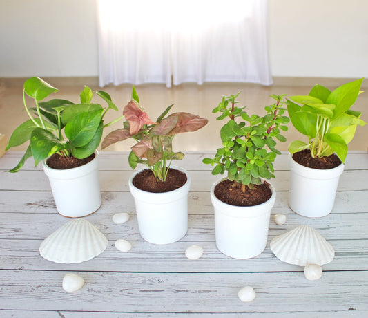 Rolling Nature Combo of Live Indoor Plants for Home Money Plant, Jade Plant, Pink Syngonium and Golden Pothos Plant in White Diamond Glacier Ceramic Pots