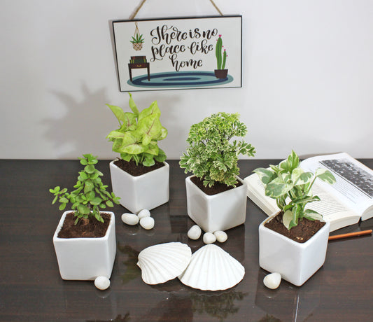 Rolling Nature Combo of Live Indoor Plants Jade, Aralia, Green Syngonium and Njoy Money plants in White Square Glacier Ceramic Pots