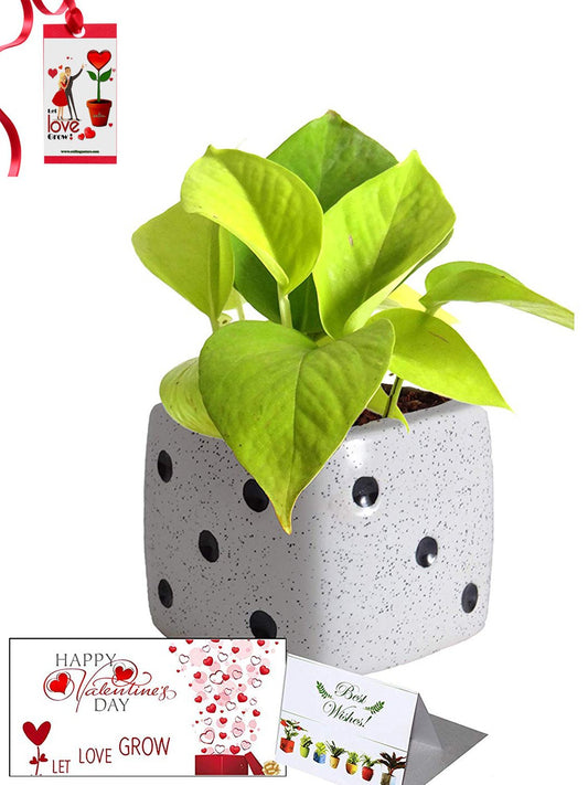 Valentine's Day Combo of Good Luck Air Purifying Golden Money Plant in White Dice Ceramic Pot