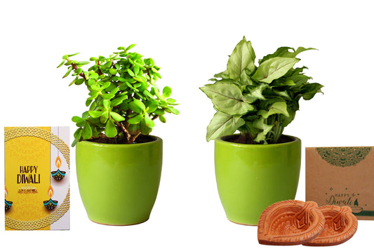 Rolling Nature Diwali Gift Combo of Good Luck Jade and Green Syngonium Plant in Green Pear Ceramic Pot