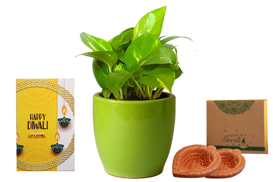Rolling Nature Diwali Gift Combo of Good Luck Air Purifying Golden Money Plant in Green Pear Ceramic Pot