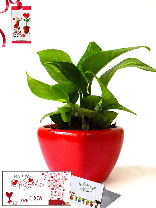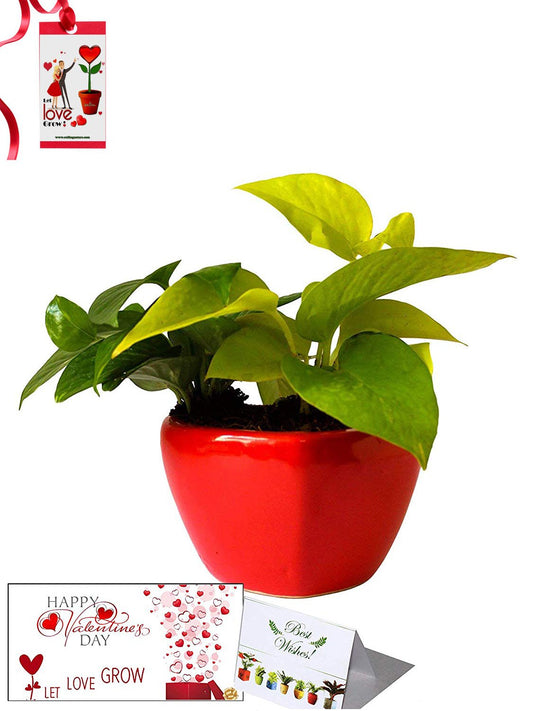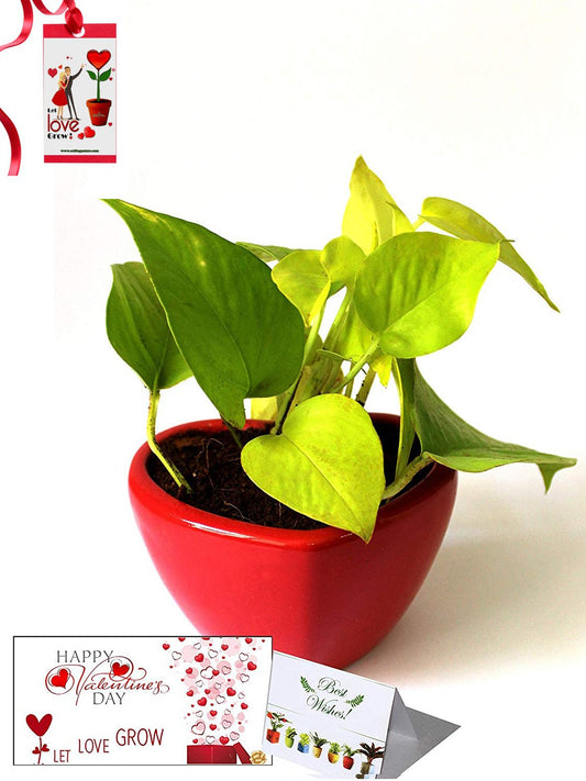 Valentine's Day Combo of Good Luck Air Purifying Golden Money Plant in Red Heart Ceramic Pot