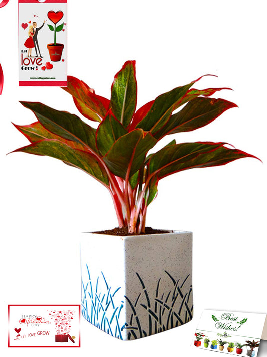 Valentine's Day Combo of Good Luck Air Purifying Red Aglaonema Siam Aurora Chinese Evergreen Plant In White Cube Aroez Ceramic Pot