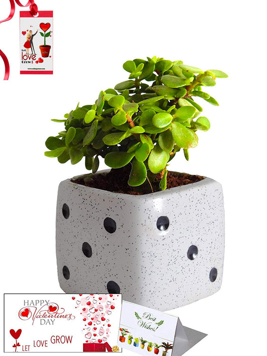 Valentine's Day Combo of Good Luck Air Purifying Jade Plant in White Dice Ceramic Pot