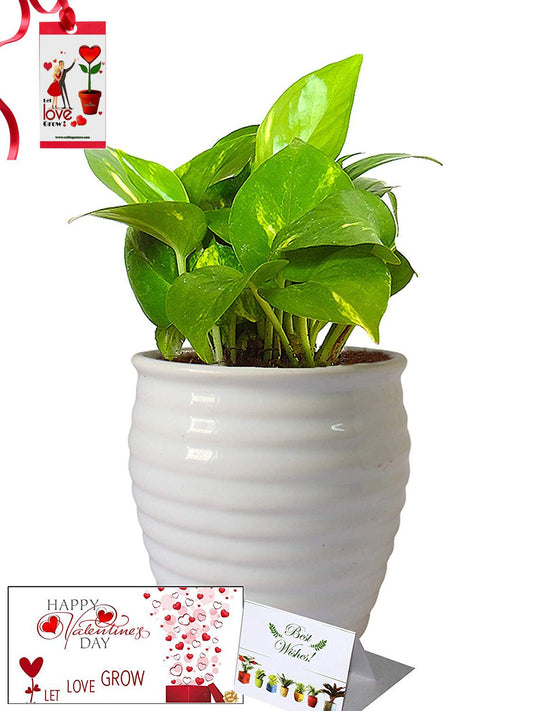 Valentine's Day Combo of Good Luck Air Purifying Money Plant in White Ceramic Pot