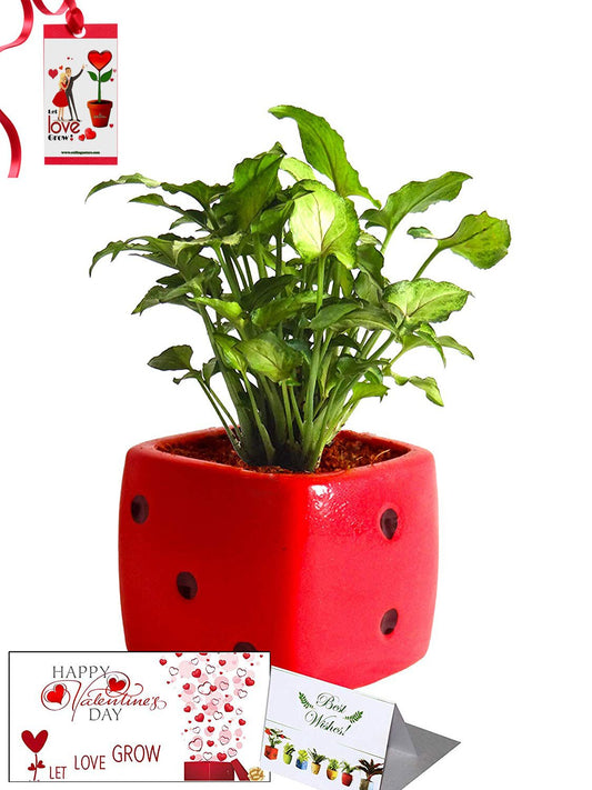 Valentine's Day Combo of Good Luck Air Purifying Green Syngonium Plant in Red Dice Ceramic Pot