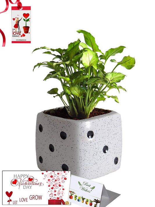 Valentine's Day Combo of Good Luck Air Purifying Green Syngonium Plant in White Dice Ceramic Pot