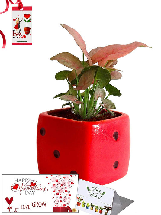 Valentine's Day Combo of Good Luck Air Purifying Pink Syngonium Plant in Red Dice Ceramic Pot