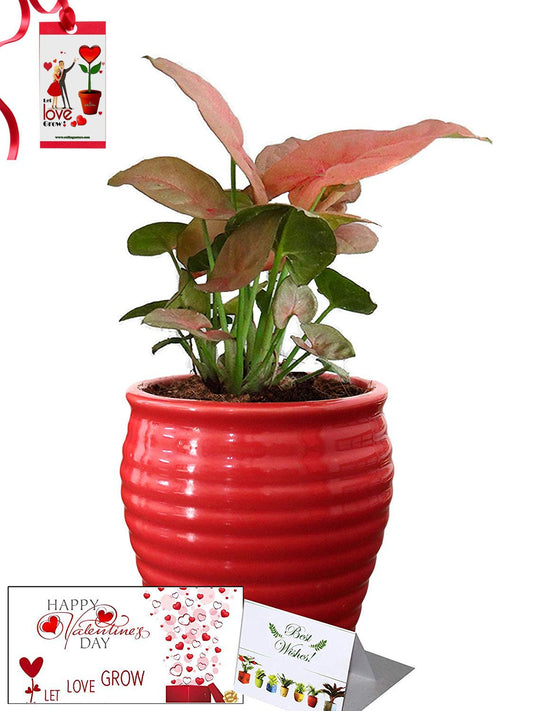 Valentine's Day Combo of Good Luck Air Purifying Green Syngonium Plant in Red Ceramic Pot
