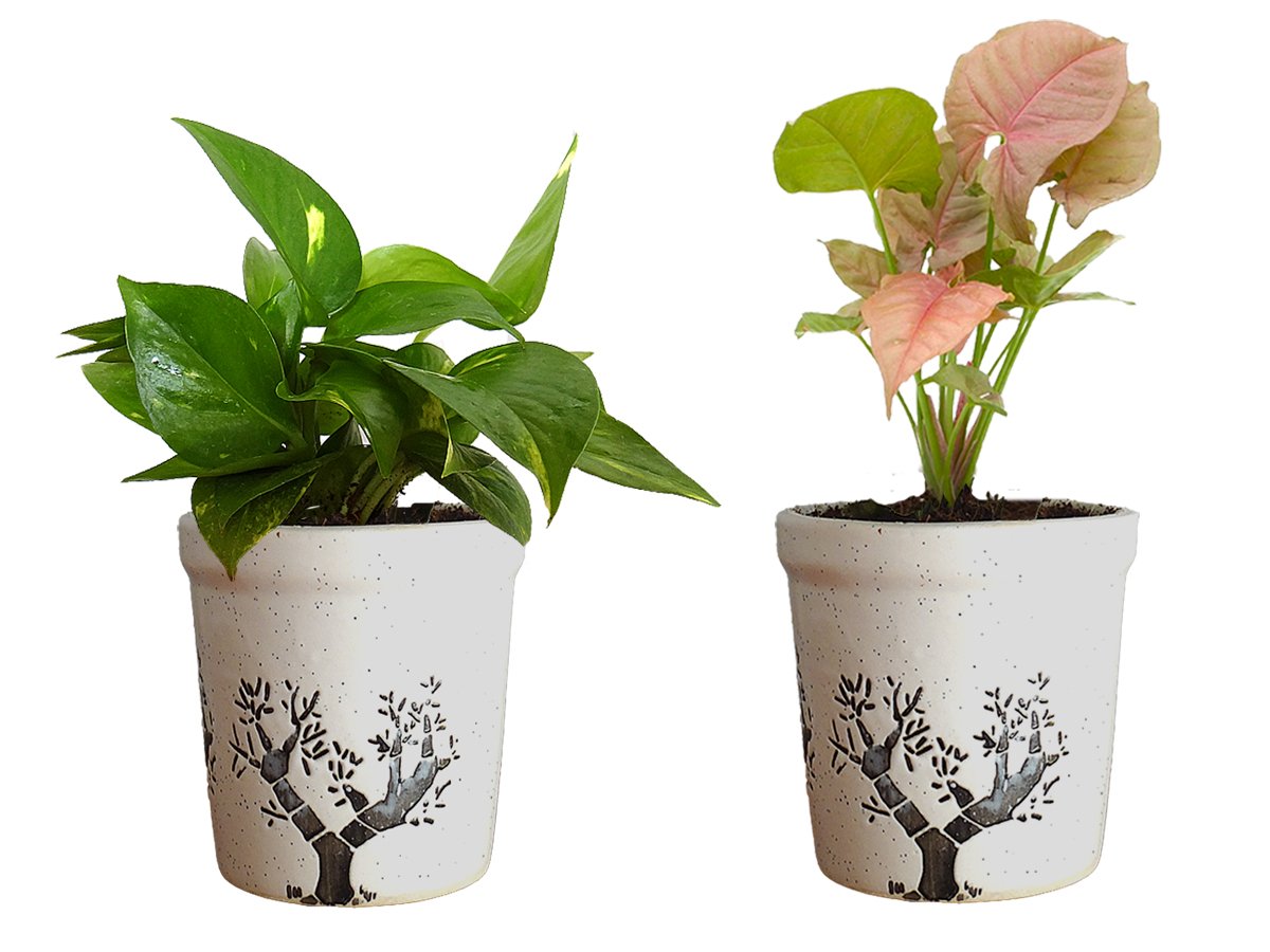 Combo Of Good Luck Air Purifying Live Money Plant and Syngonium Pink Plant in White Jar Aroez Ceramic Pot