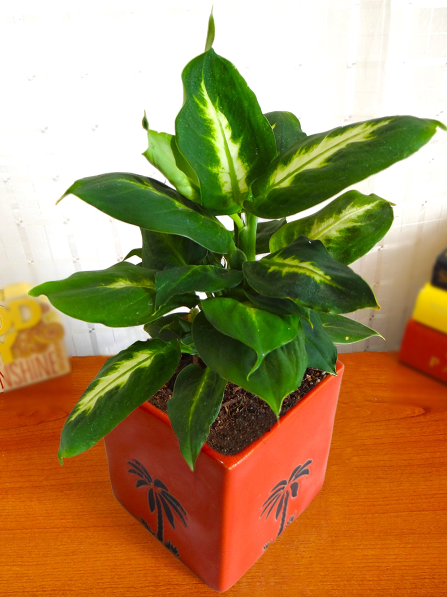 Water: Water the plant often enough to keep the soil lightly moist but never wet or soggy. Droopy leaves indicate that the plant needs water and brown tips indicate that you are waiting too long between waterings. Dieffenbachia doesn’t require high humidity, but will benefit from occasional misting. Important: Upon delivery please remove any packaging from the plant. Water thoroughly, preferably by standing the plant in a bucket of water for 10 minutes or so, as the plant may have been in transit for few days. We hope our plant will give you many years pleasure.