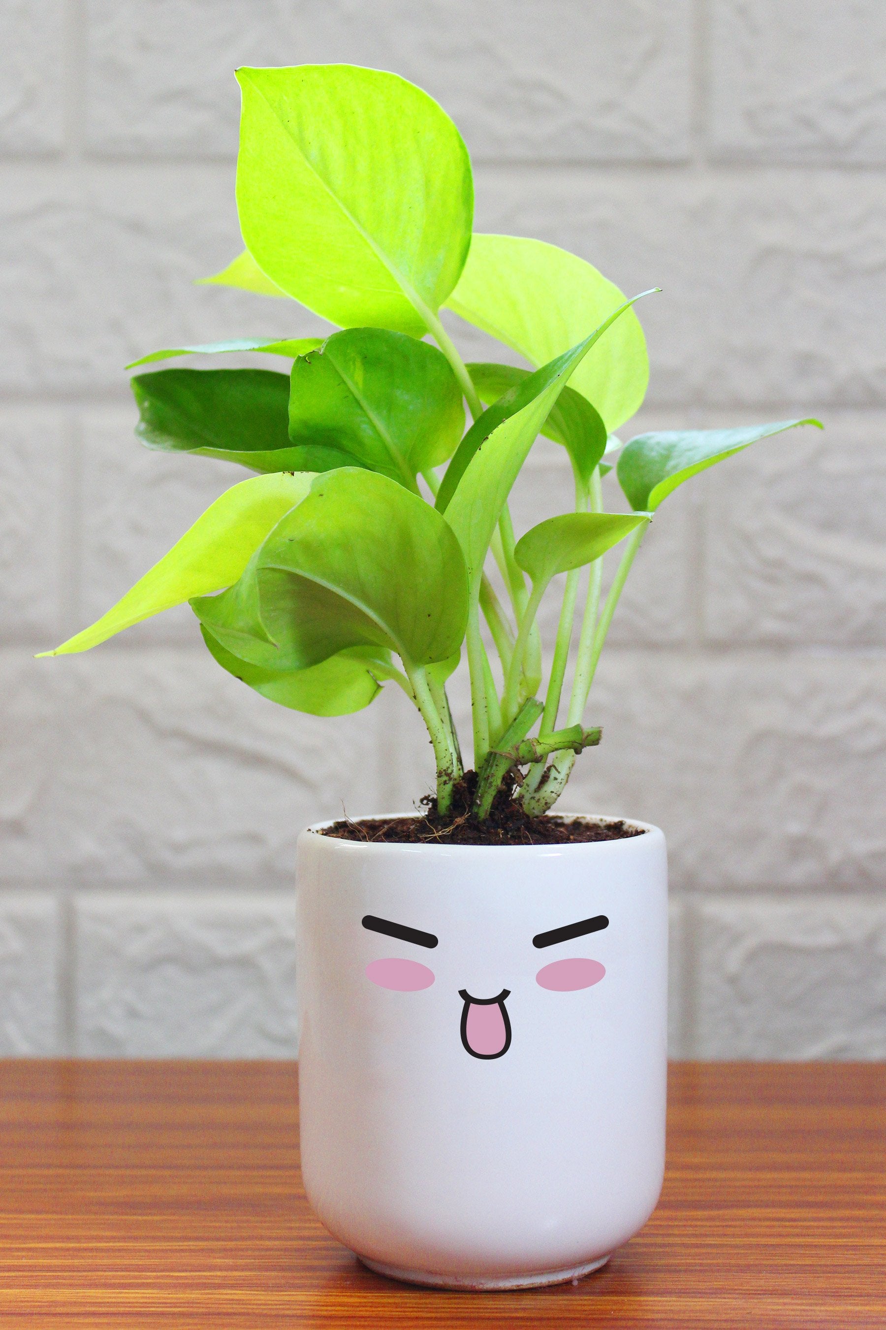 Good Luck Air Purifying Golden Money Plant in Crazy Emoji White Ceramic Pot