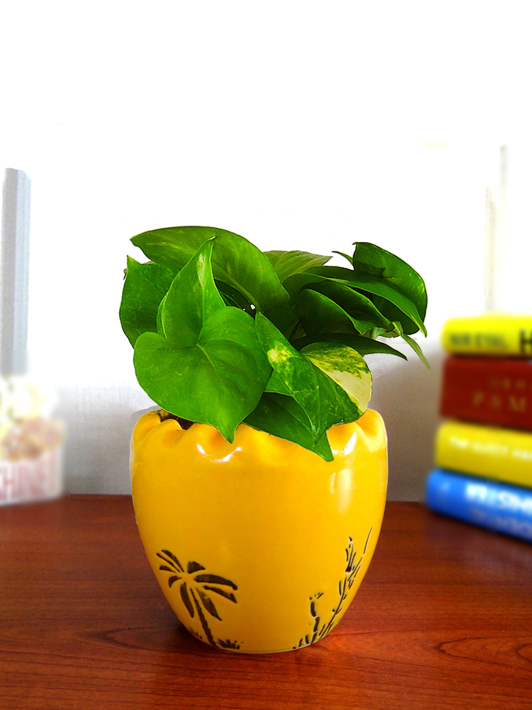 Good Luck Air Purifying Live Money Plant in Yellow Ruffel Aroez Ceramic Pot