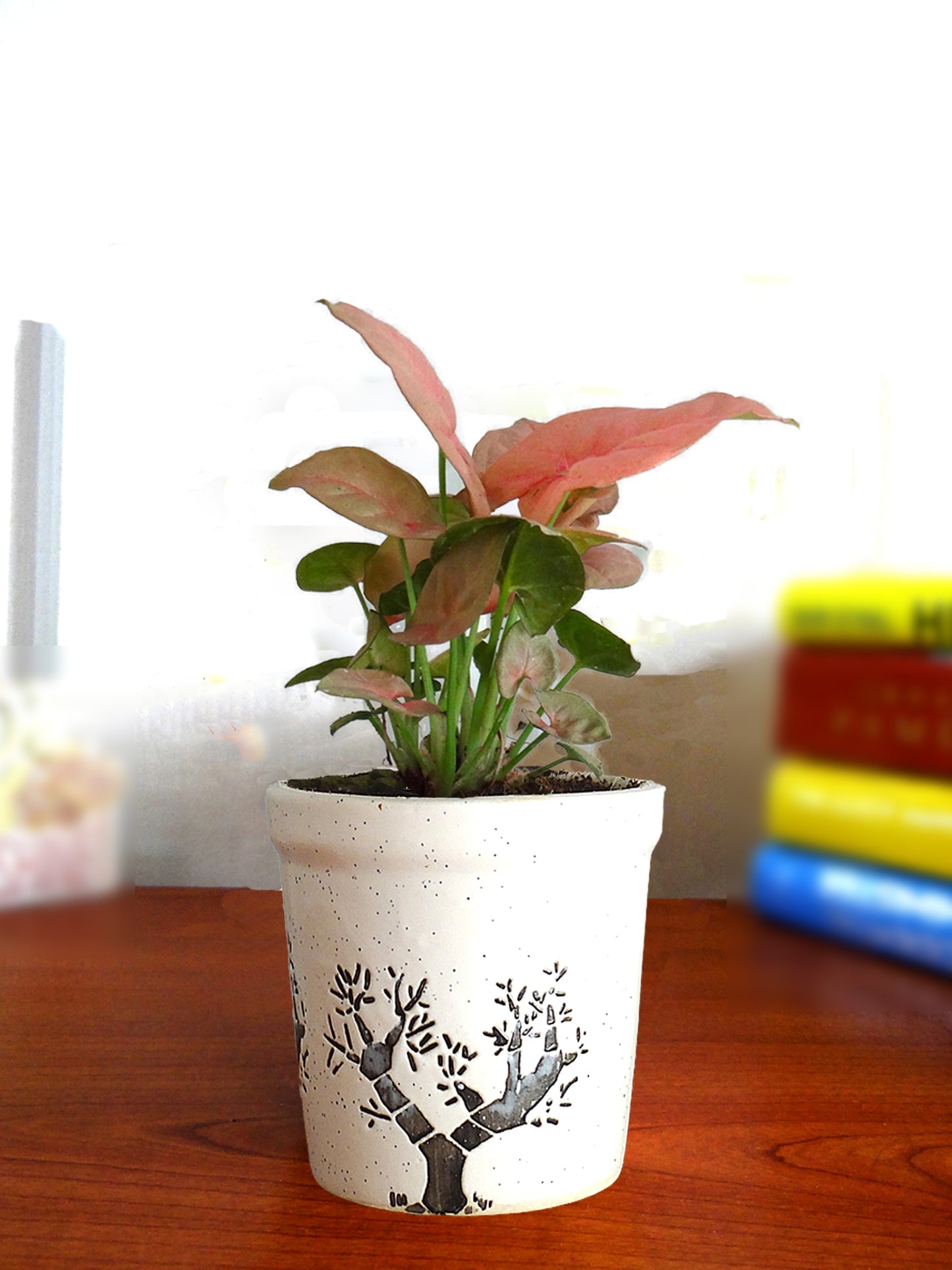 Bring your garden inside with elegant indoor plants & embossed ceramic pots from Rolling Nature. Rolling Nature's Aroez ceramic pot collection designs are inspired by Italian Sgraffito pottery. The pot is made from high quality clay to ensure durability and longevity. These piece of arts with beautiful green plants in them will mesmerize you. Living plants indoors enhances your decor with several other benefits such as airpurification and humidification! A perfect house plant. The five lobed shape of Syngonium podophyllum/ Goosefoot leaves represents the 5 Feng Shui elements; water, fire, earth, wood and metal. Thus it perfectly balances Yin and yang energy and encourages positive chi or energy. It also cleanses the air. It has the inspiring; 'upward' wood energy, which is associated with the east or southeast. Place it on a desk or workstation to let its spirit of spring; dawn, youth and new ideas aid inspiration. Syngonium is an easy to care for plant that is well adapted to indoor environments. Its dark-green leaves have silvery white, green or pink or cream variegation, making this a decorative and popular house plant.