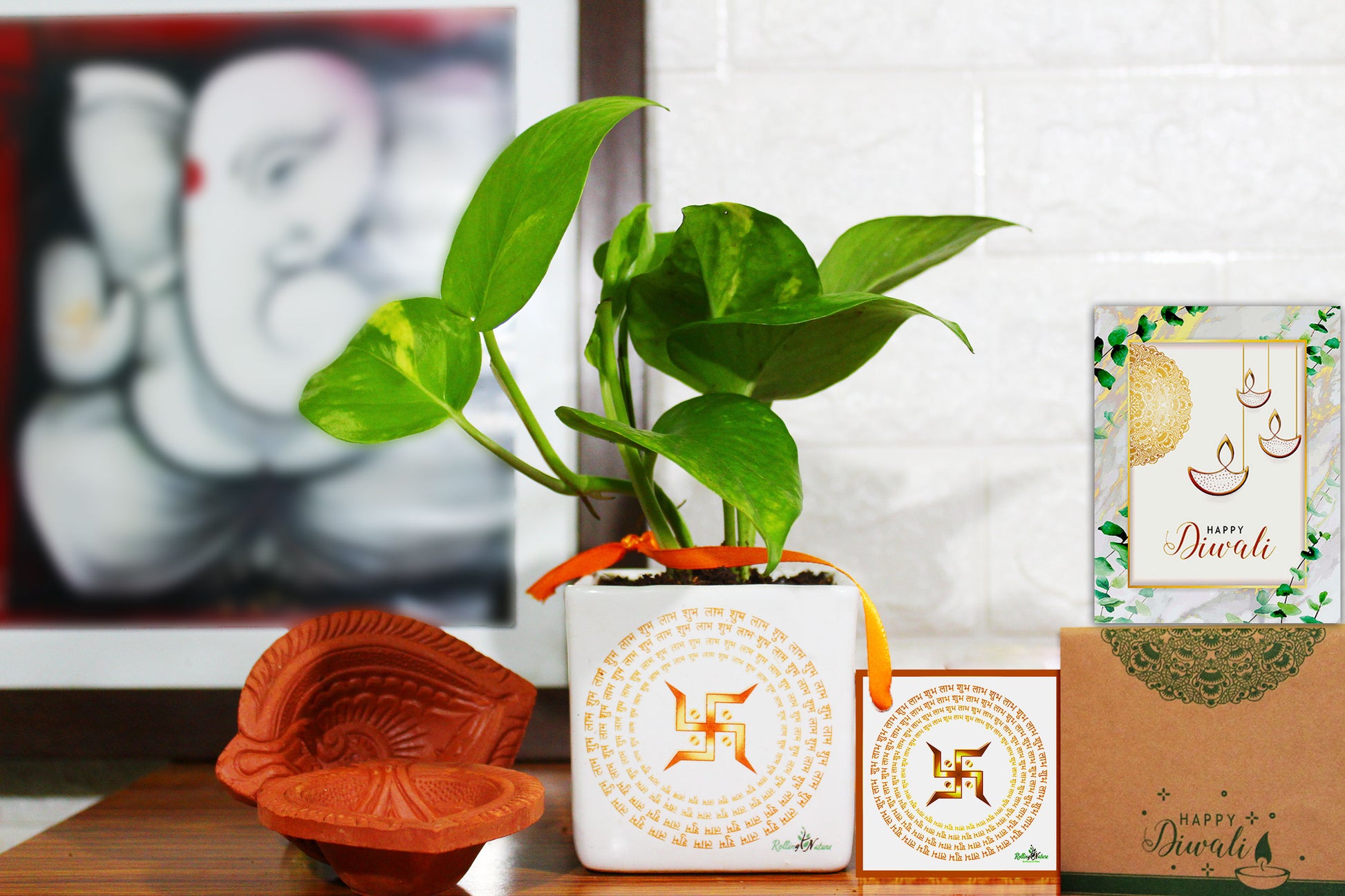 - Material: Natural Live Plant & Exclusively Designed High Quality Ceramic Pot, Qty: 1 (Plant with Pot), 1 Tag, 1 Greeting Card & 2 Diya with diya box, Care Info