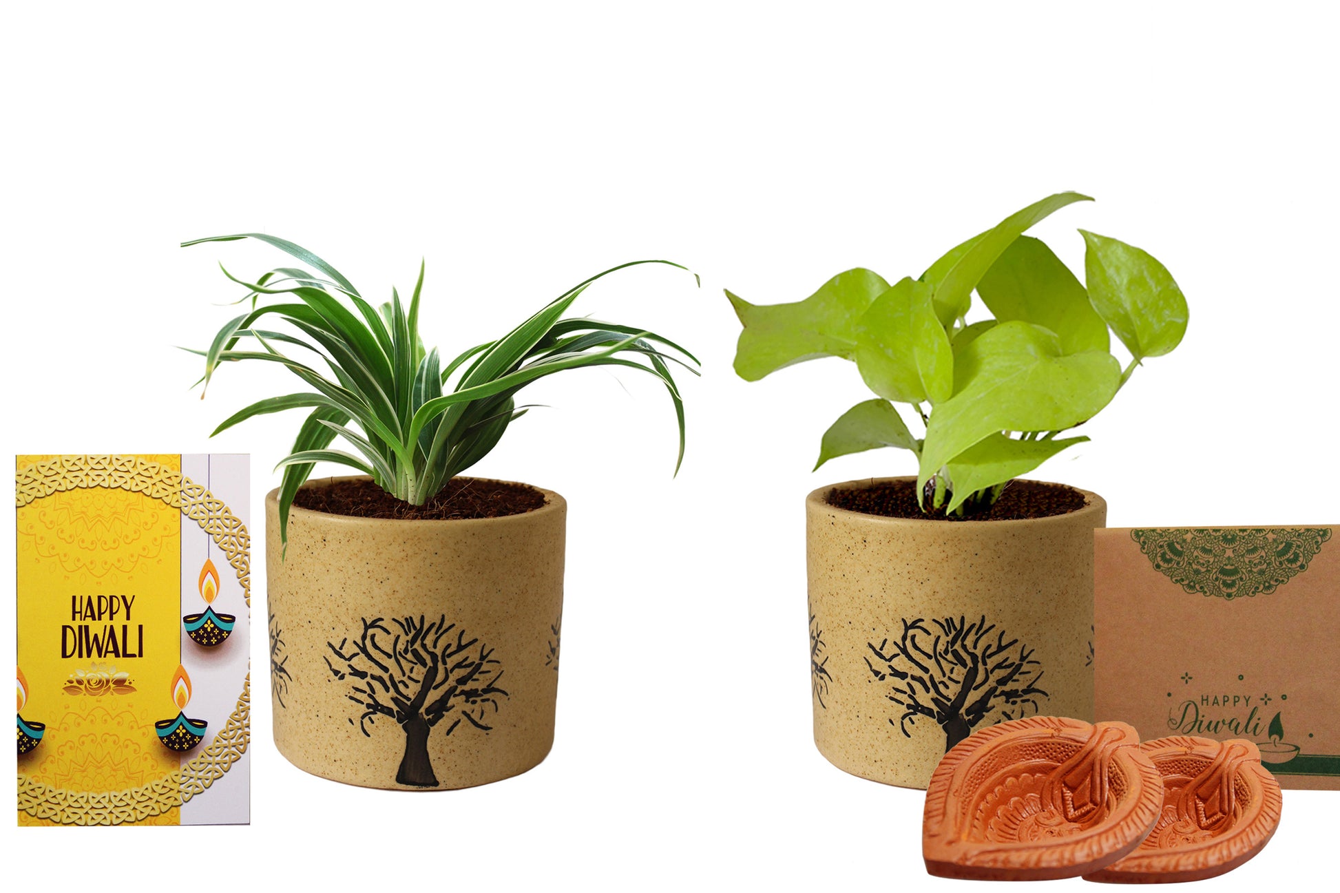 - Material: Natural Live Plant & Handcrafted Ceramic Pot, Qty: 2 Plant with Pot, 2 Diyas & Big Greeting Card with Diwali Special Message Inside