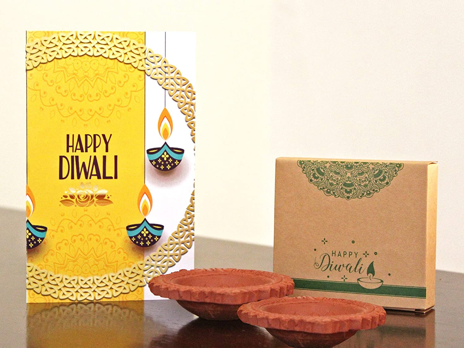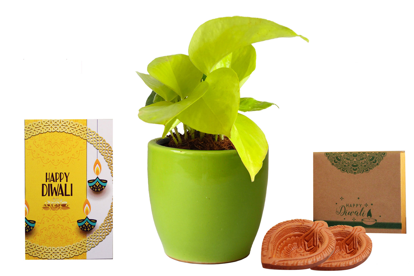- Material: Natural Live Plant & Handcrafted Ceramic Pot, Qty: 1 Plant with Pot, 2 Diyas & Big Greeting Card with Diwali Special Message Inside