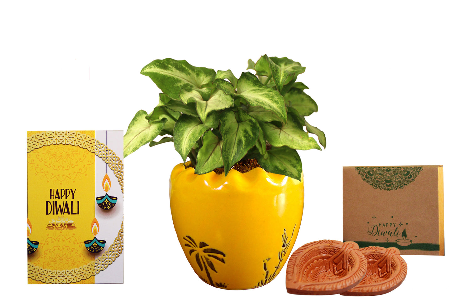 - Material: Natural Live Plant & Handcrafted Ceramic Pot, Qty: 1 Plant with Pot, 2 Diyas & Big Greeting Card with Diwali Special Message Inside