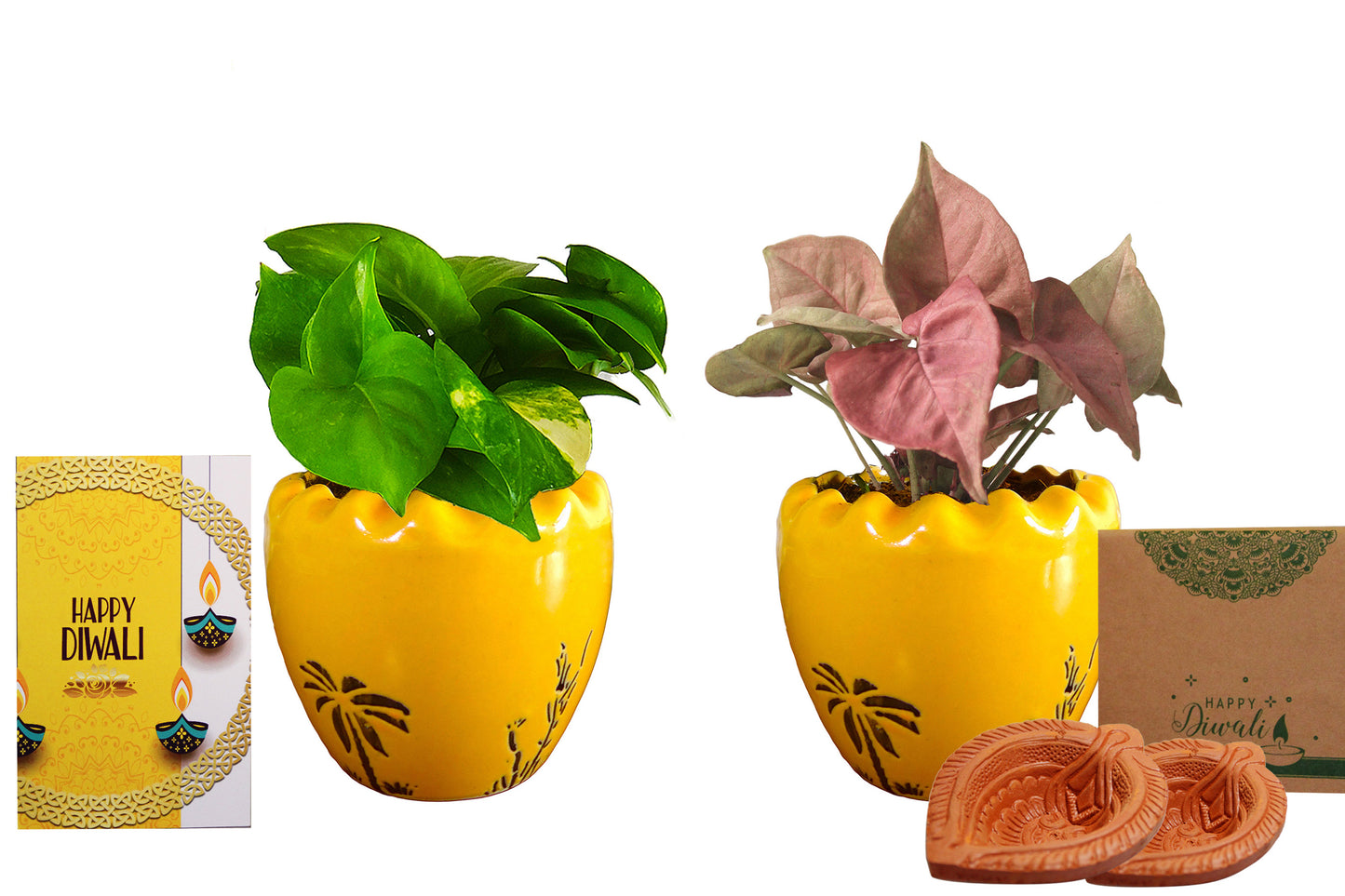 - Material: Natural Live Plant & Handcrafted Ceramic Pot, Qty: 2 Plant with Pot, 2 Diyas & Big Greeting Card with Diwali Special Message Inside