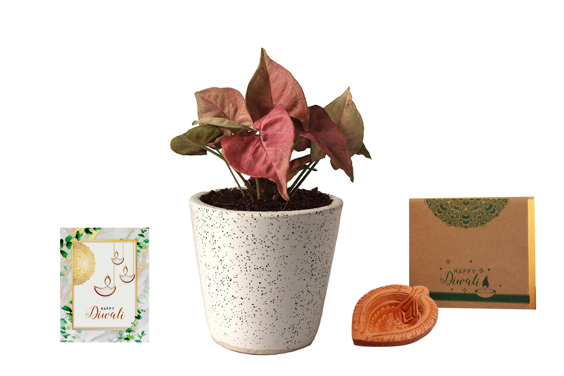 Rolling Nature Diwali Gift Combo of Good Luck Air Purifying Live Pink Syngonium Plant in White Bucket Dew Ceramic Pot