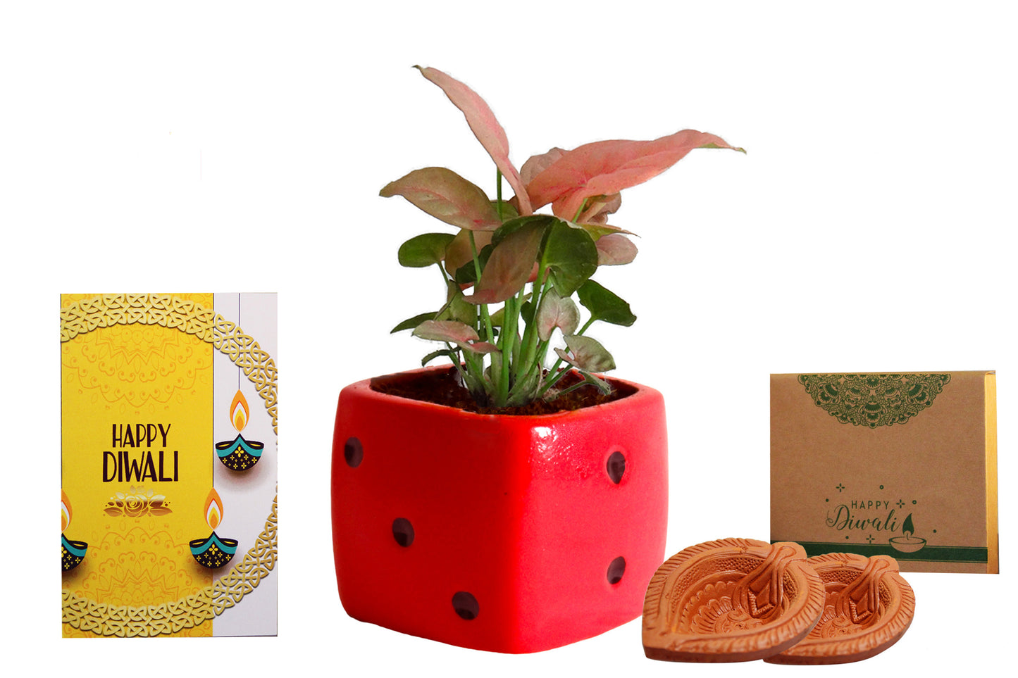 Rolling Nature Diwali Gift Combo of Good Luck Air Purifying Pink Syngonium Plant in Red Dice Ceramic Pot