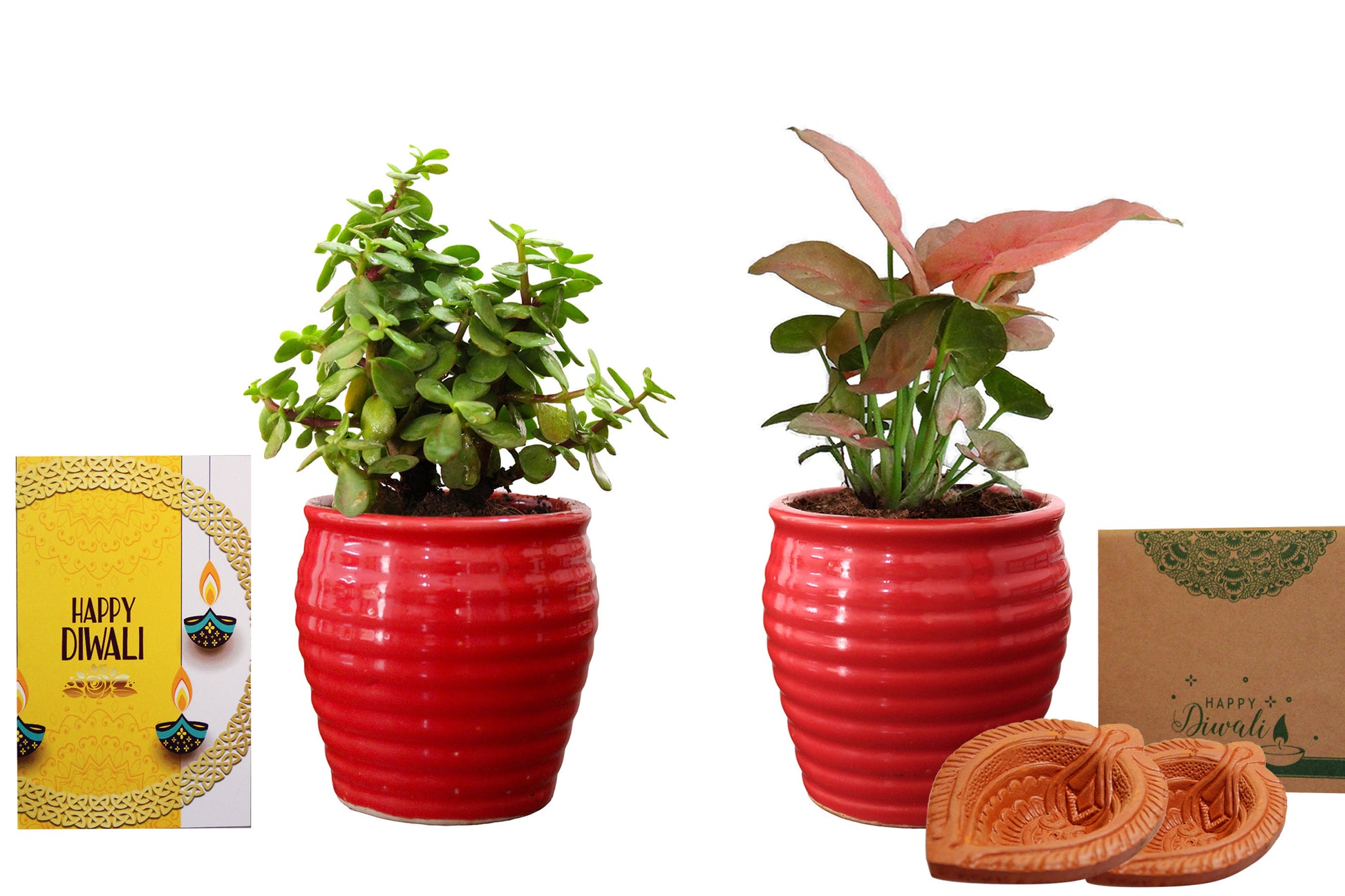 Rolling Nature Diwali Gift Combo of Good Luck Jade and Pink Syngonium Plant in Red Ceramic Pot