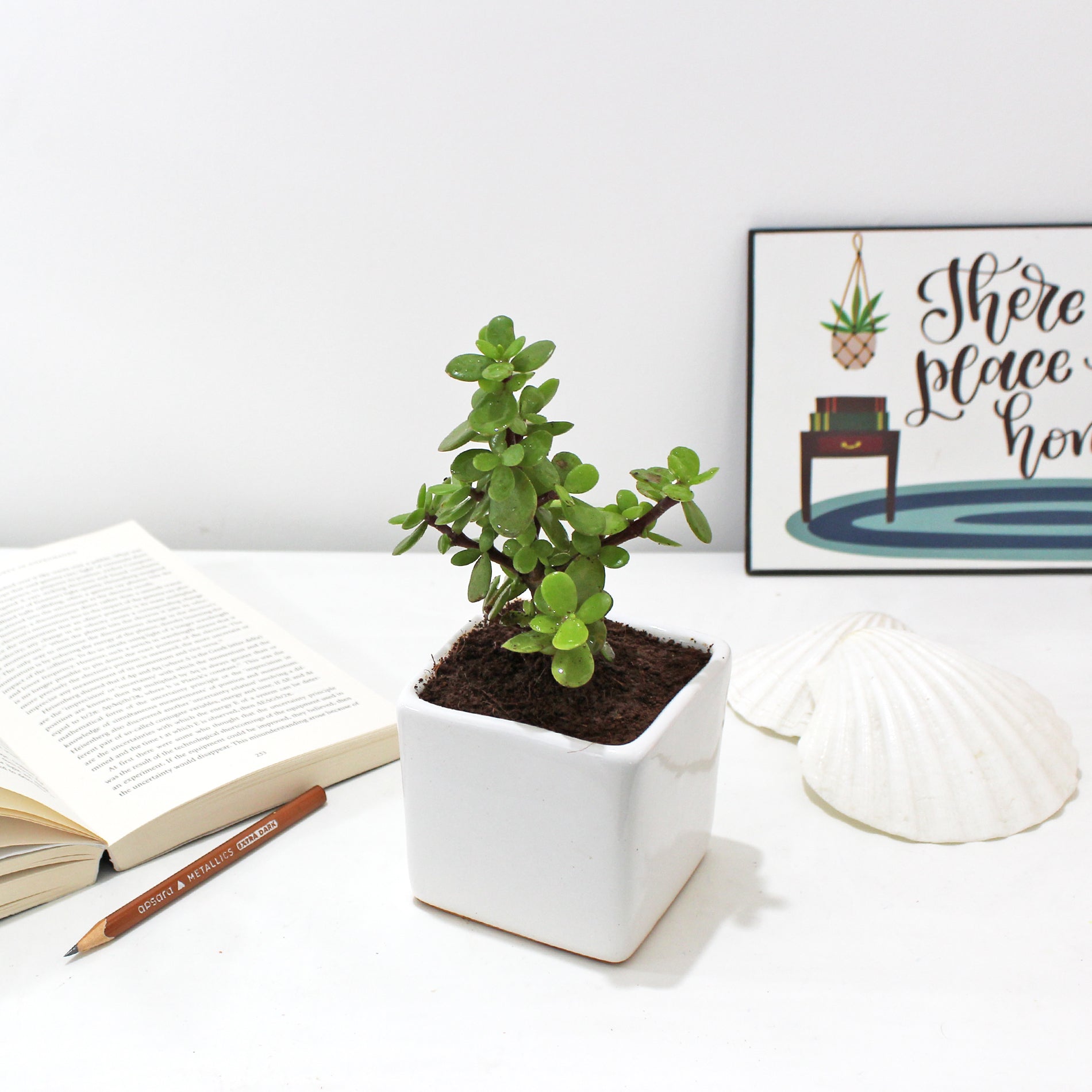 Rolling Nature Jade Plant Good Luck Indoor Live Plant in White Square Glacier Ceramic Pot