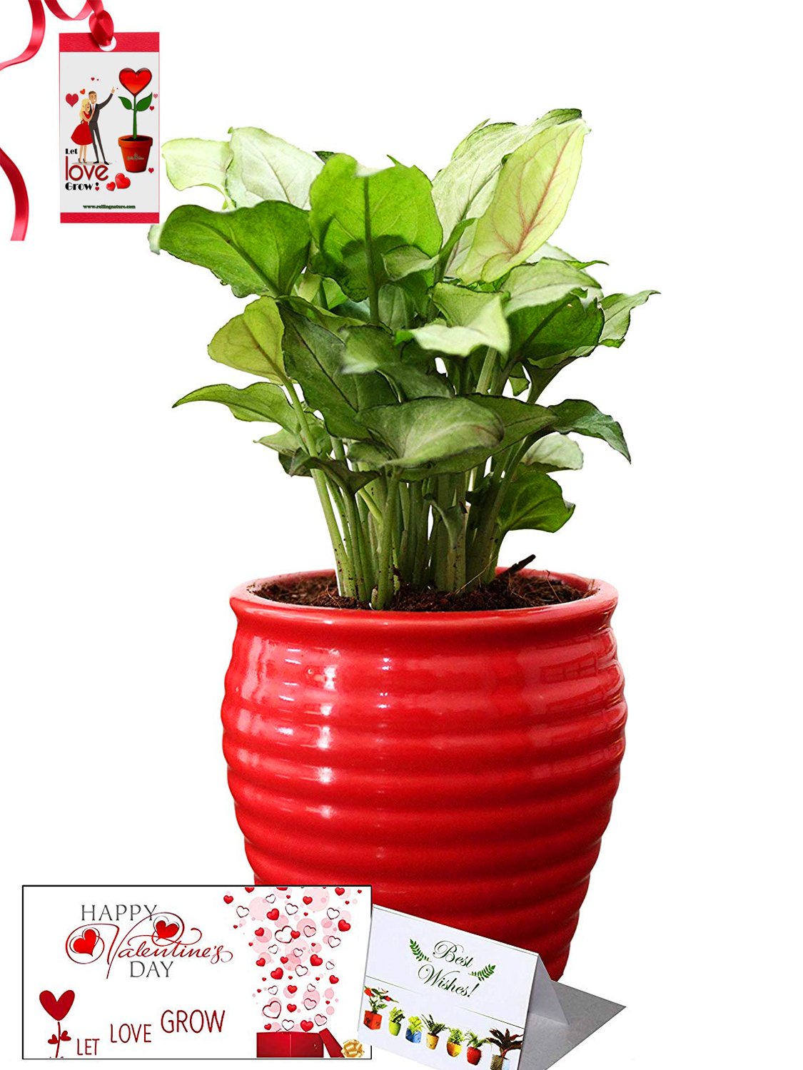 Valentine's Day Combo of Good Luck Air Purifying Green Syngonium Plant in Red Ceramic Pot