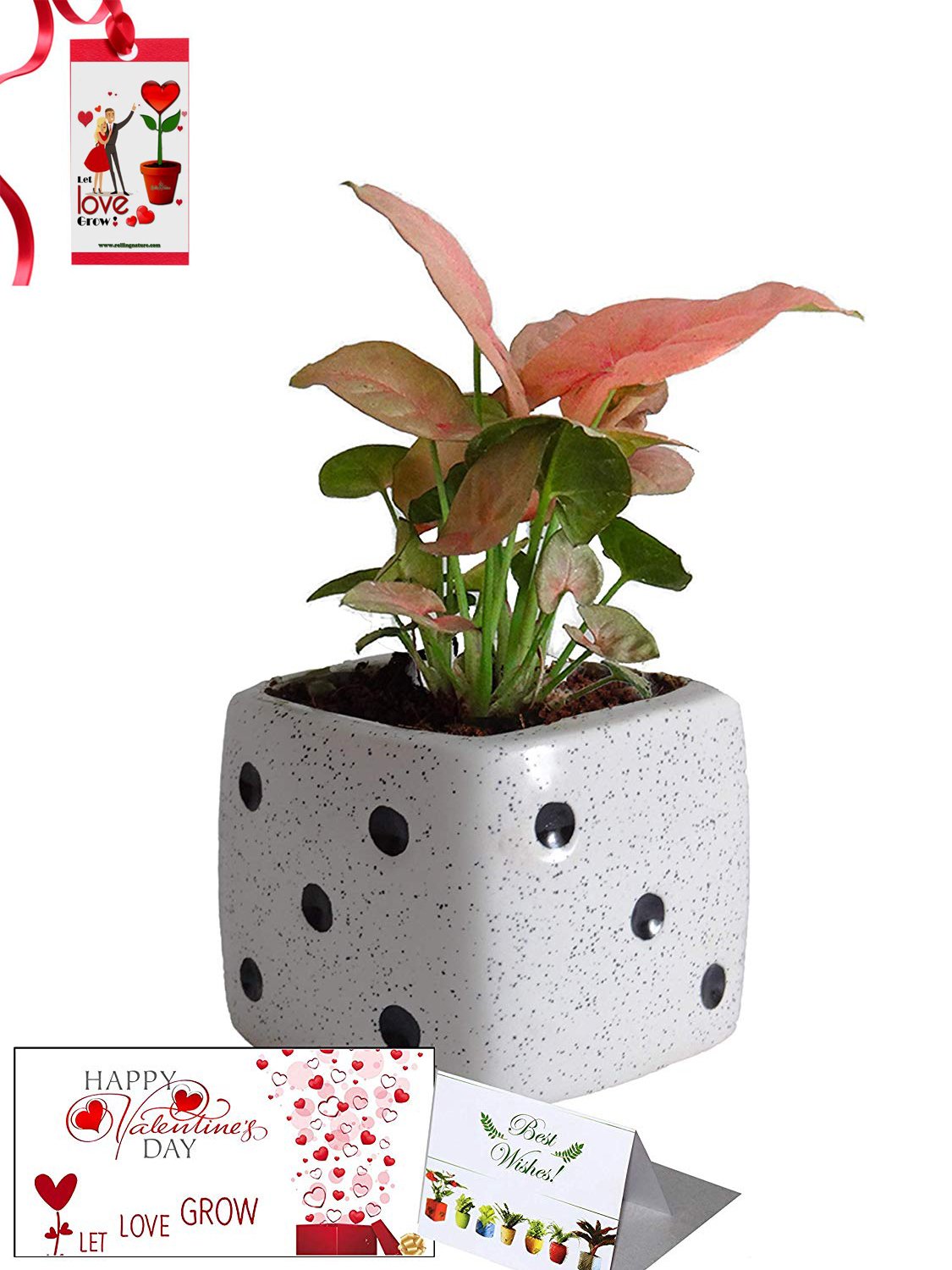 Valentine's Day Combo of Good Luck Air Purifying Pink Syngonium Plant in White Dice Ceramic Pot